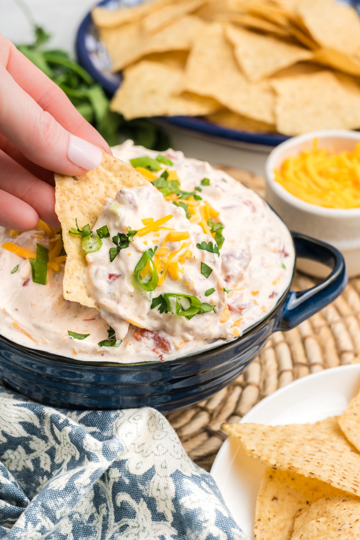 - This is a chilled dip, but let it sit at room temperature for 10-15 minutes before serving so it softens slightly. If it's too cold, it can be hard to scoop and may cause the chips to break.
