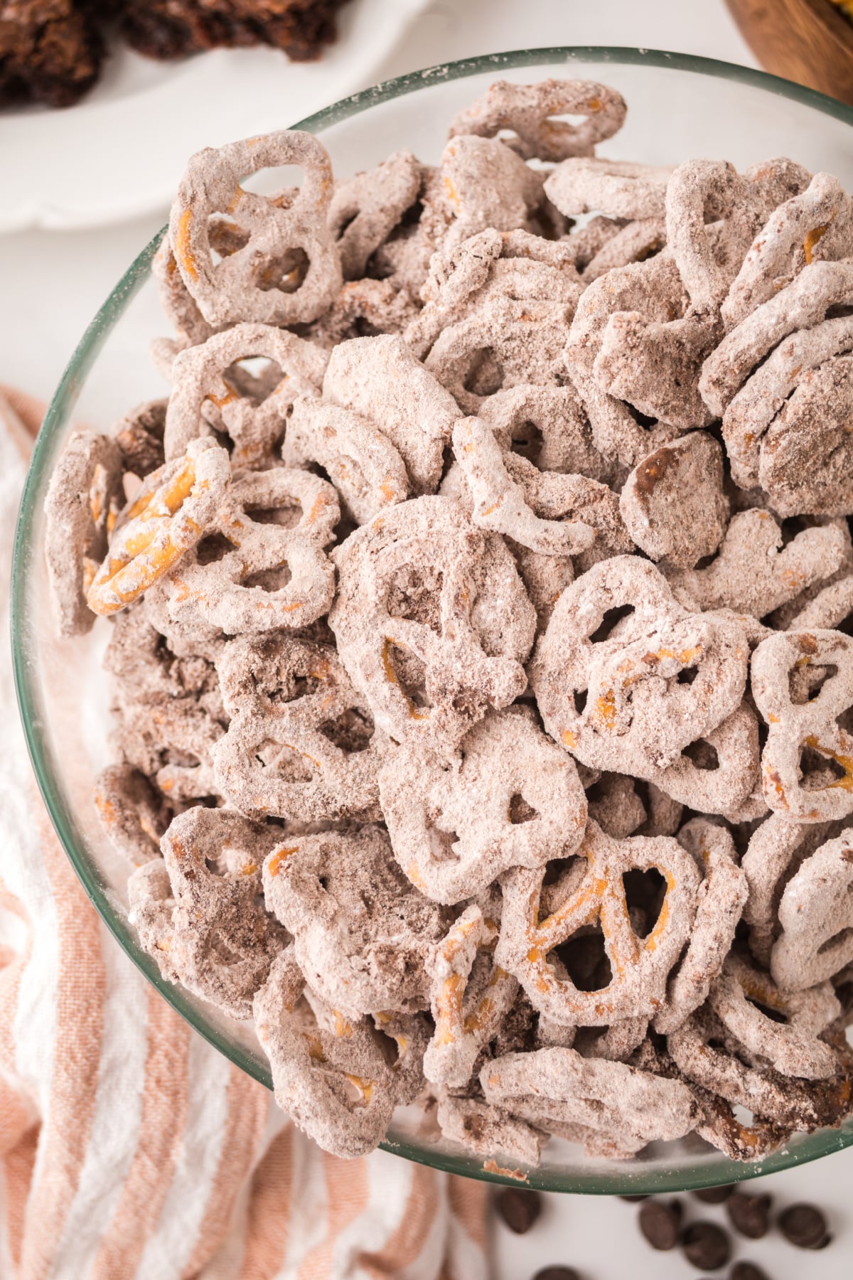 Do crunchy mini pretzels coated with silky melted chocolate, tossed in brownie mix and powdered sugar appeal to you? If so, these Brownie pretzels are a fudgy, crave-worthy masterpiece soon to become your new favorite snack. They are just like Muddy Buddies but made with pretzels instead. I wouldn't be surprised if you think they taste even better.