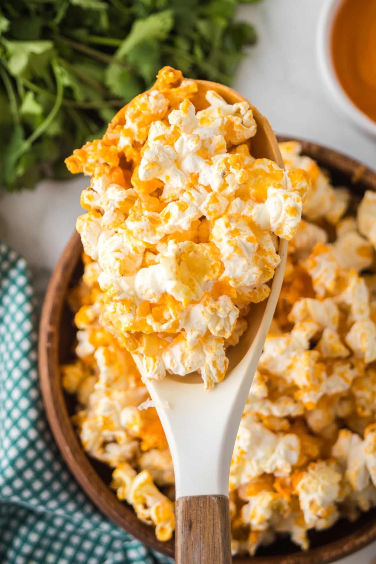 - Toss gently: Keeps popcorn intact.