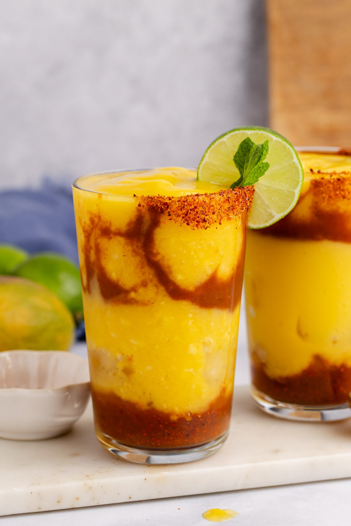 - Fill each glass about halfway with frozen mango mixture, then another tablespoon chamoy sauce, then the remaining mango mixture.