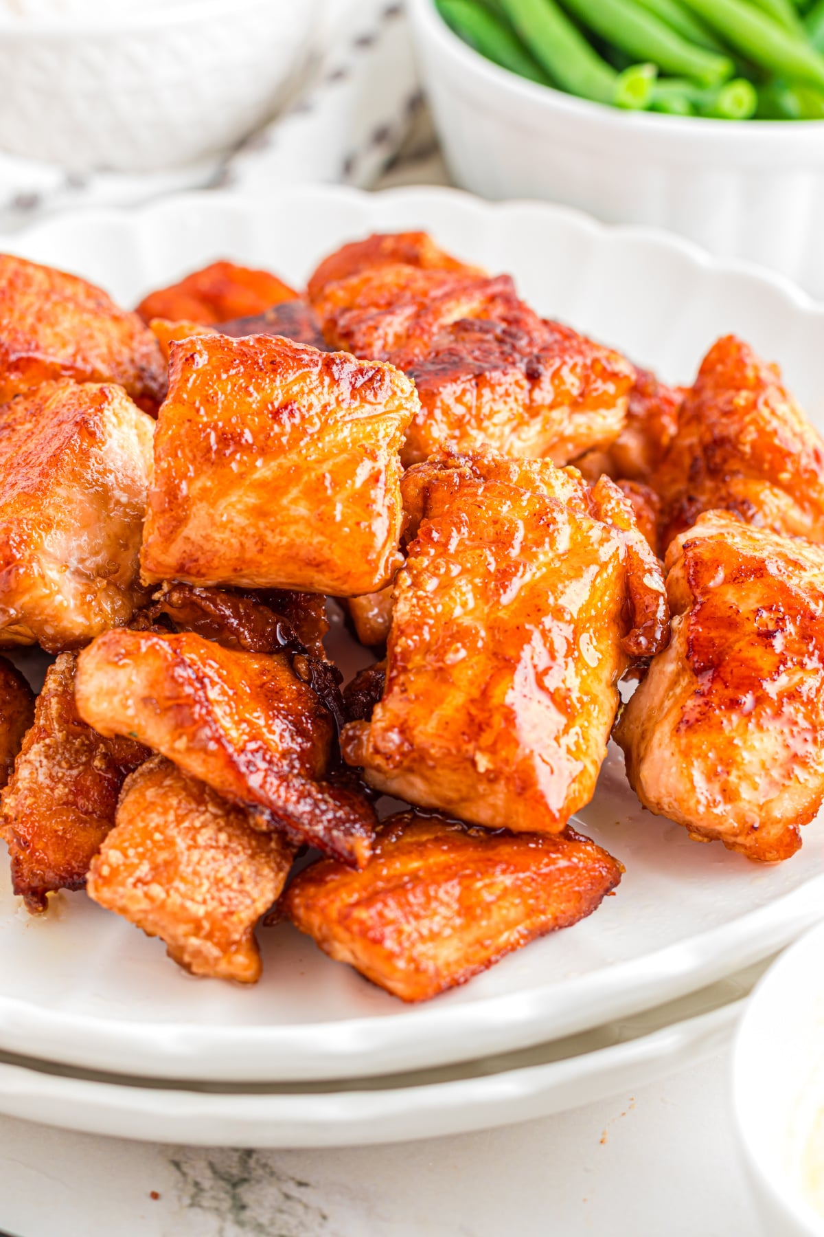 - Some of my favorite veggies to enjoy with this easy salmon bites recipe are sweet green beans and bang bang cauliflower over a simple bowl of jasmine rice,