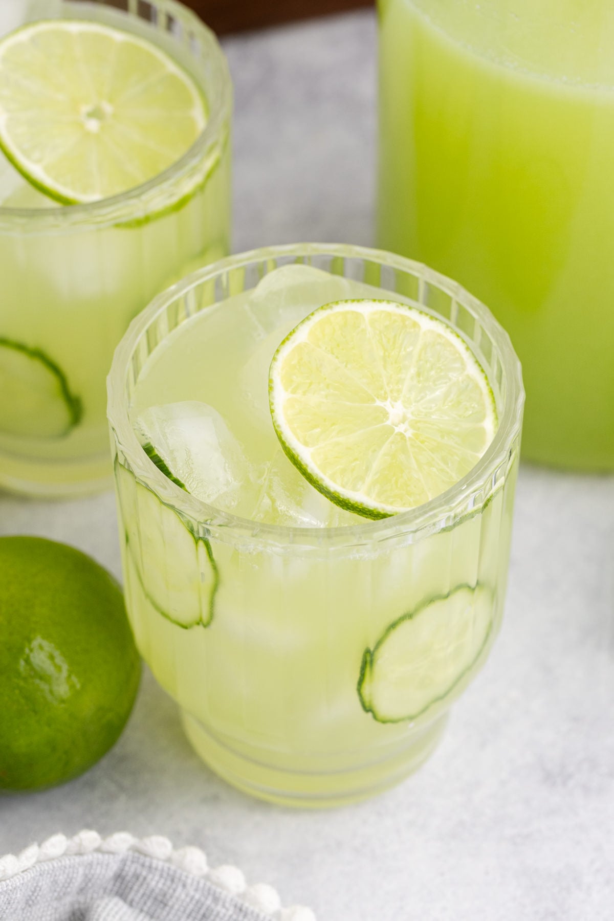 - Make it fancy: Add a Tajin or sugar rim with lime juice to the glasses before pouring your cucumber drink to make the presentation feel sophisticated and fancy. Even a lime slice on the rim works, too!