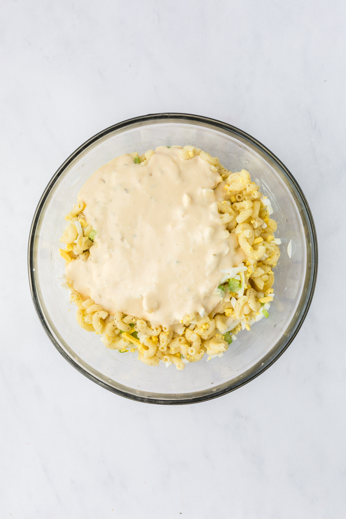 Step 3: Add Mayo Mixture. Add the mayonnaise dressing to the pasta egg mixture and fold it in well until completely incorporated.