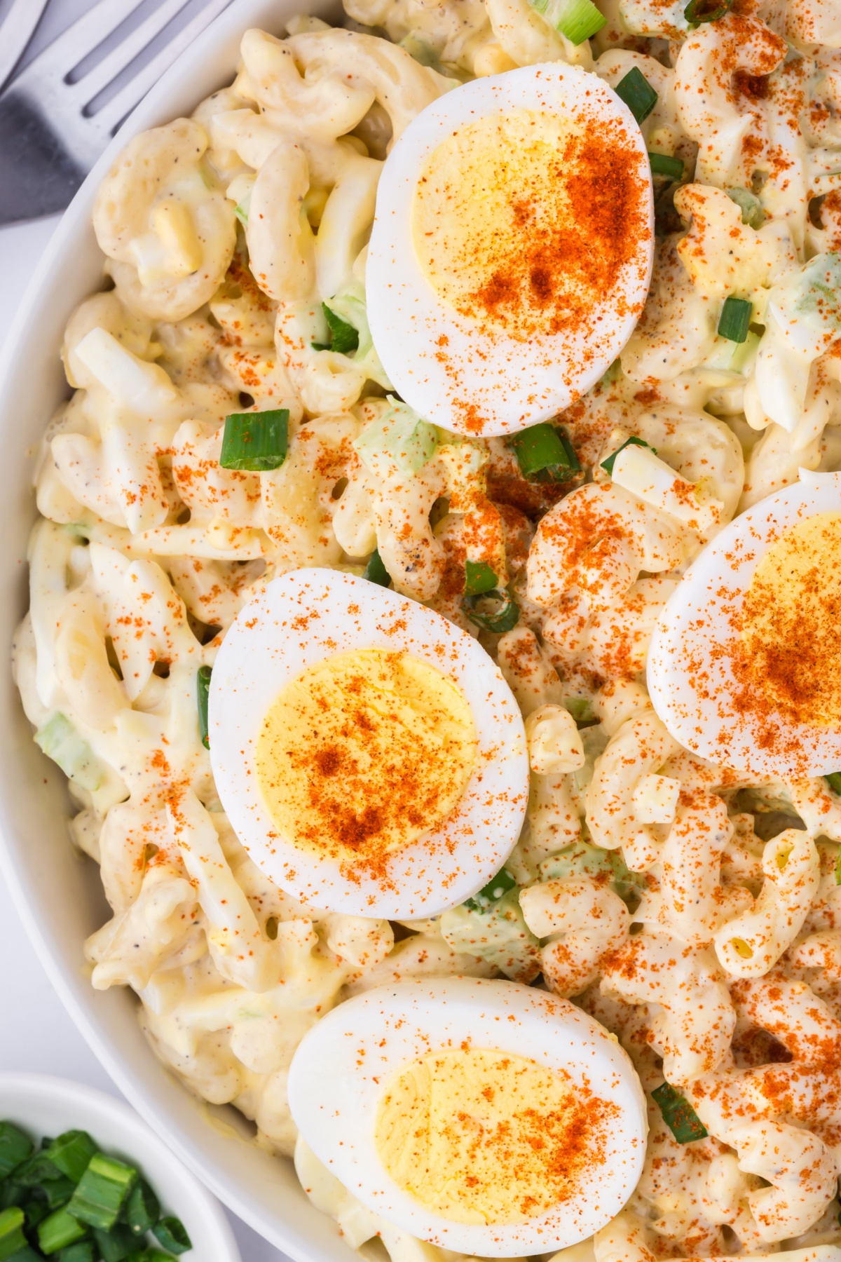 This recipe is easy to make and comes together in a few simple steps. Once your eggs are boiled and your pasta is cooked, all that's left is mixing, garnishing, and chilling.