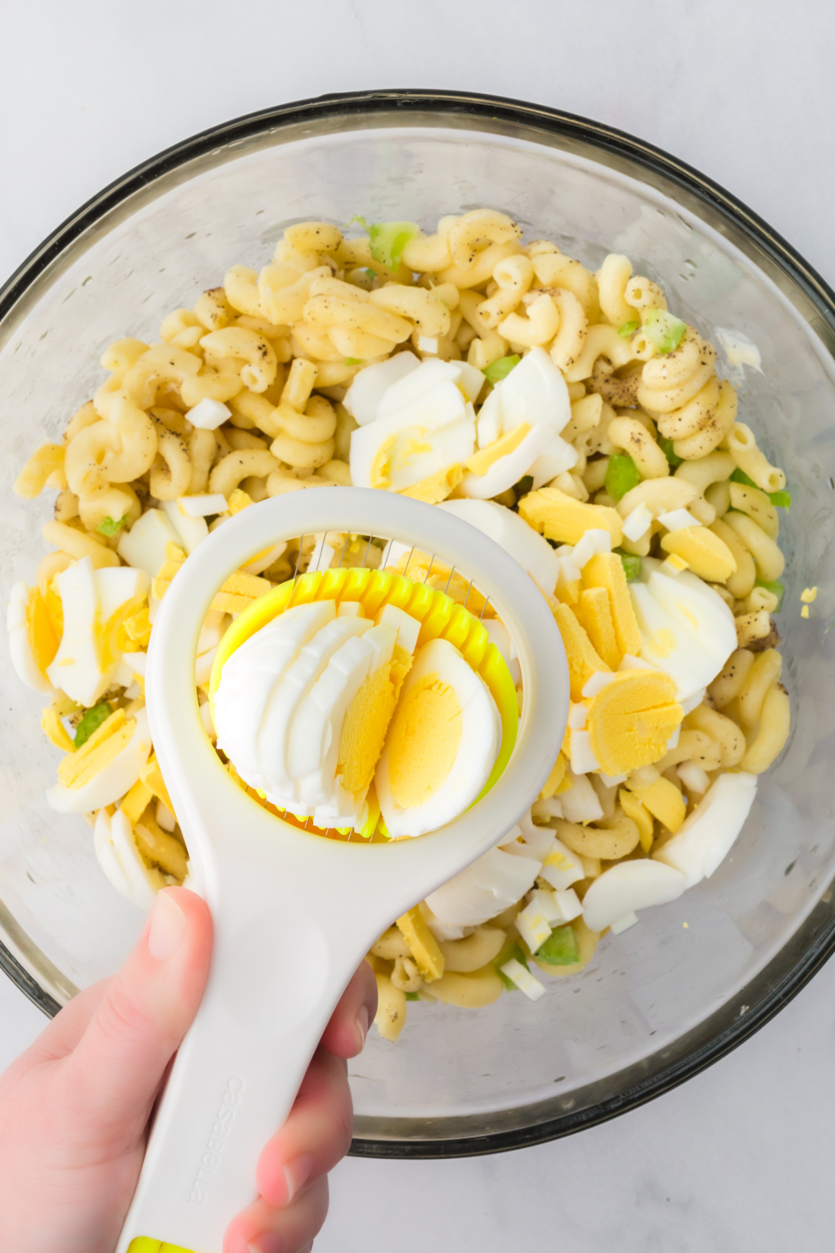 Step 2: Add Sliced Eggs. Then slice 8 of your hard-boiled eggs over the bowl into the pasta mixture. Combine well with the pasta.