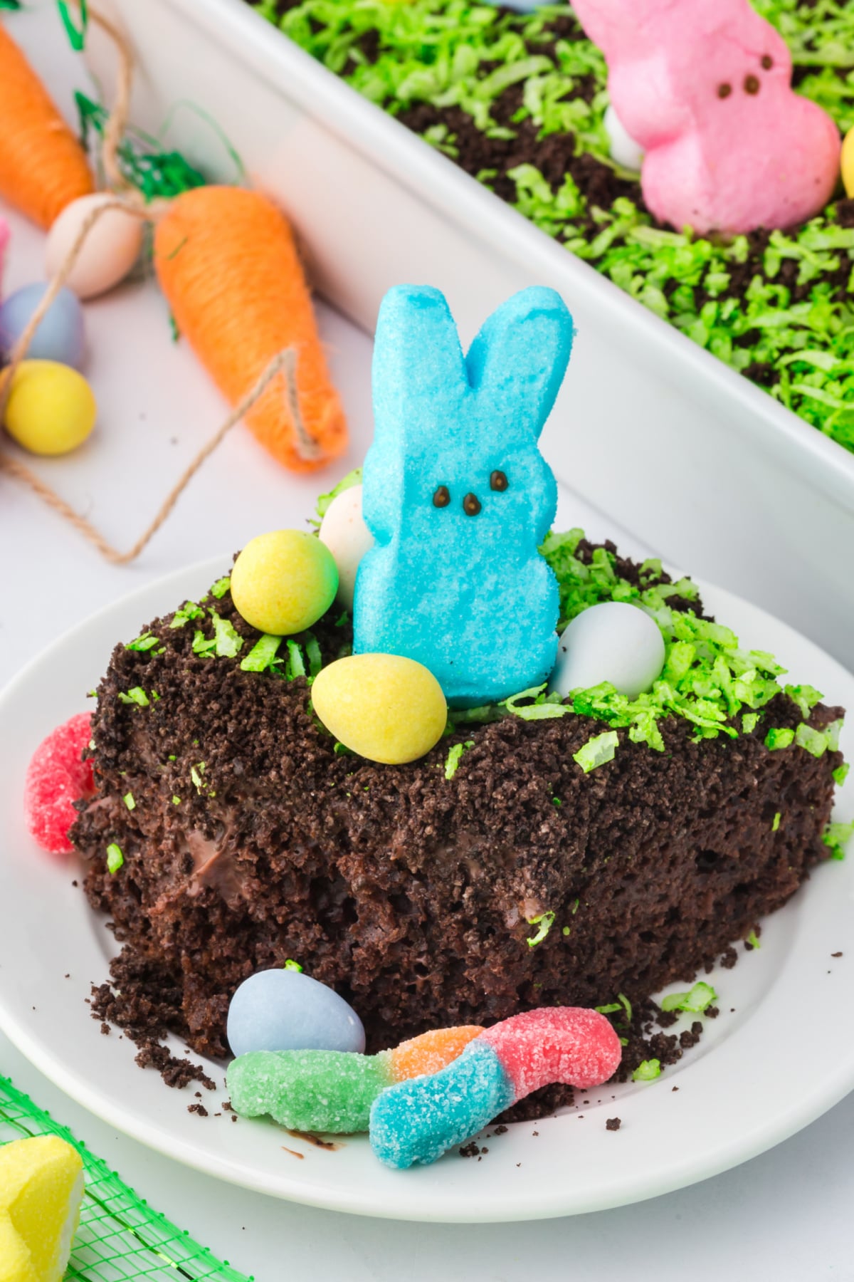 - Decorations: The shredded coconut is colored green to resemble grass, and then topped with bunny peeps and egg-shaped chocolates. You can add gummy worms as well if you like!