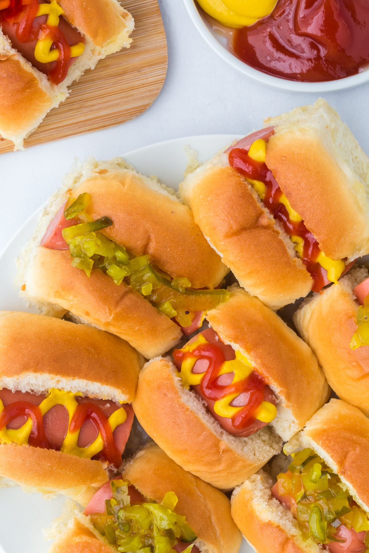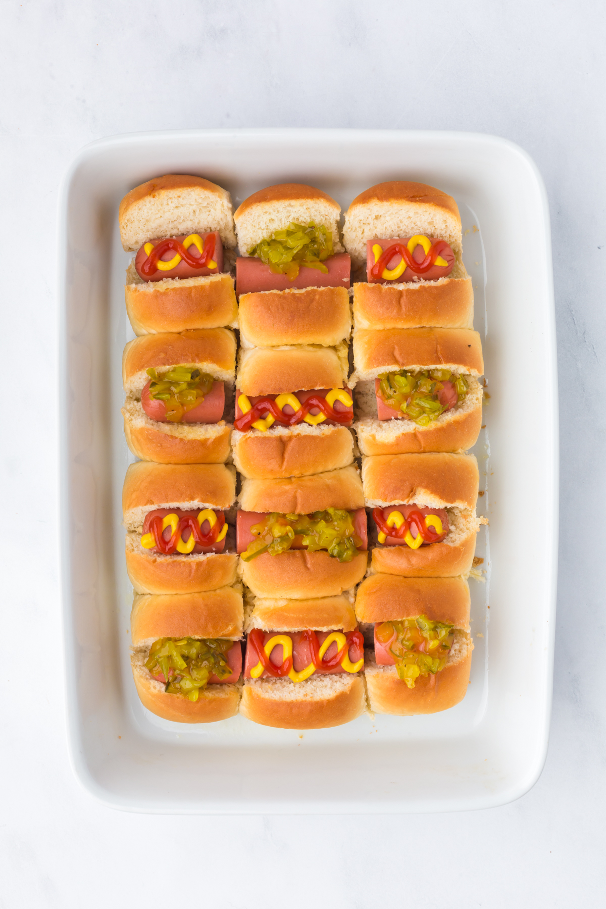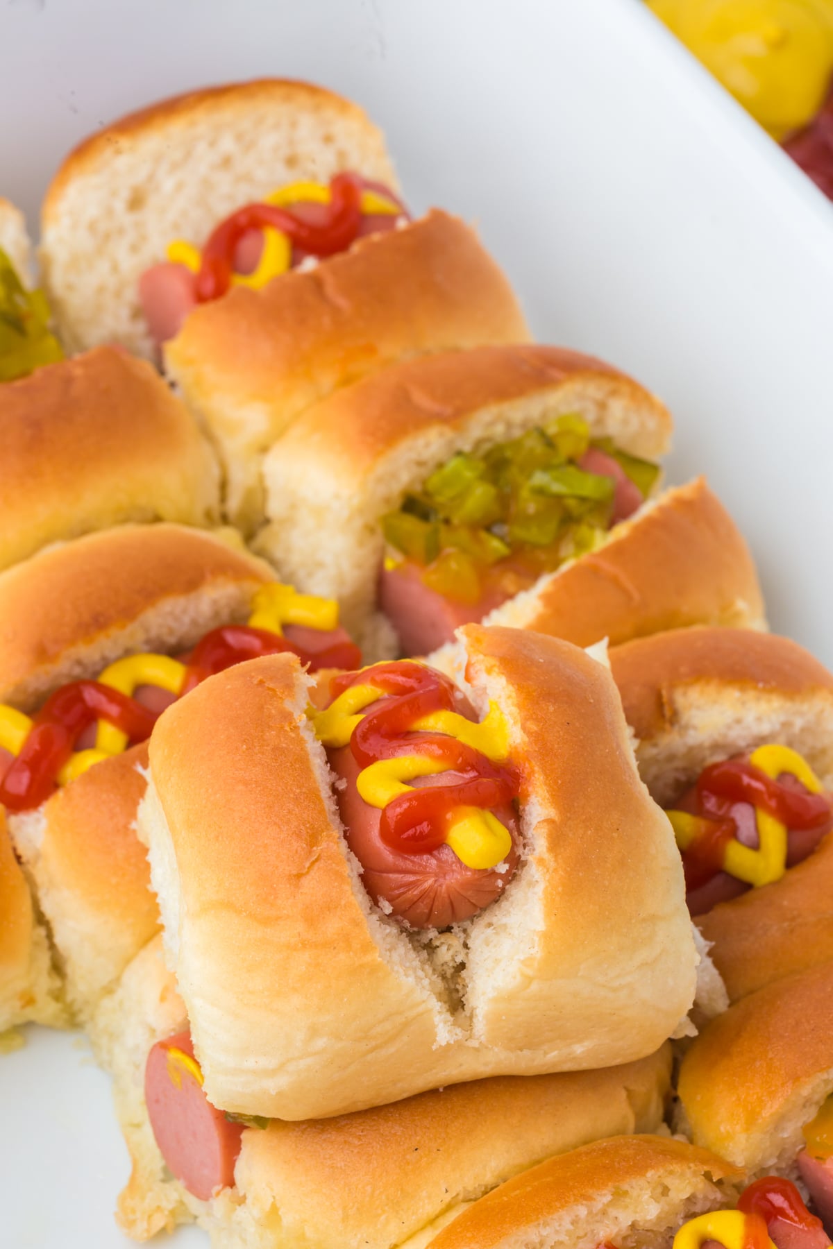 - Separate the sliders and add your favorite hot dog toppings. Serve.