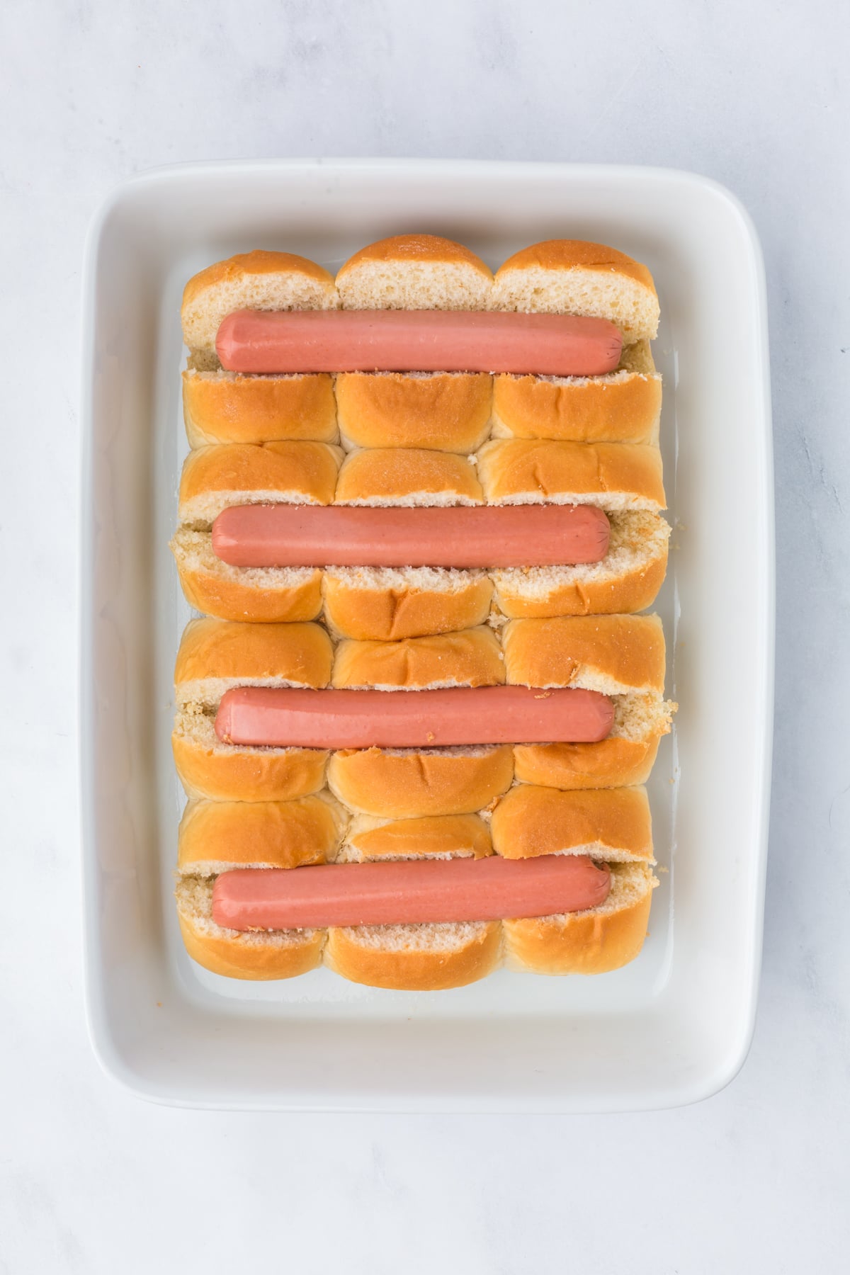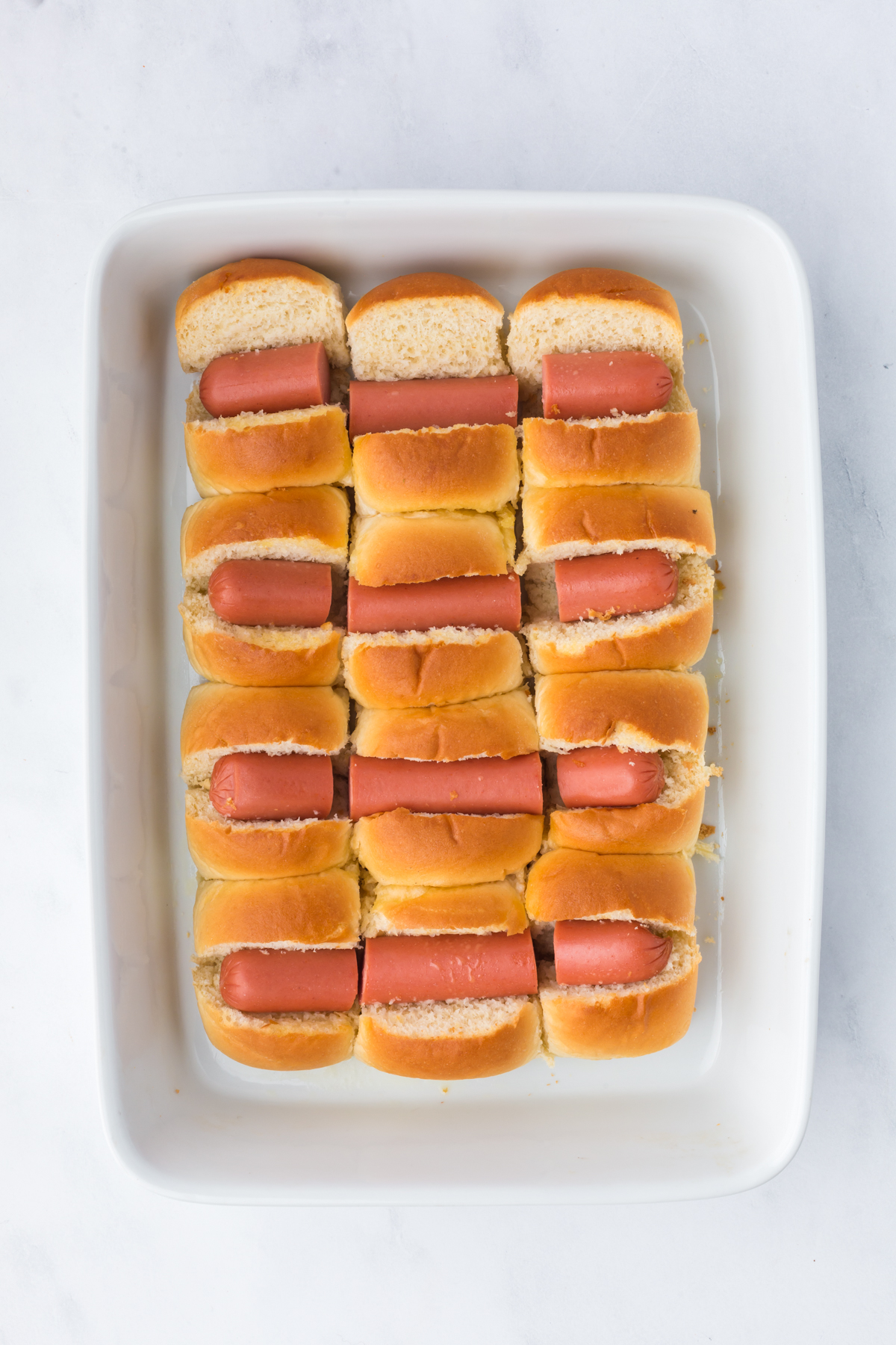 Place your sliders into the bottom of your casserole dish and cut a slit into the tops of the buns about ¾ of the way to the bottom. Spread the cuts slightly and push a slice of cheese inside, if using, followed by a hot dog inside the cheese in each slit.