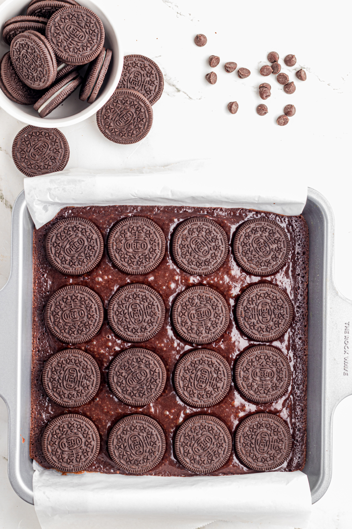 Step 2: Add Oreos. Remove partially baked brownies (parbaked) from the oven and arrange 16 Oreo cookies in an even layer over the brownies.