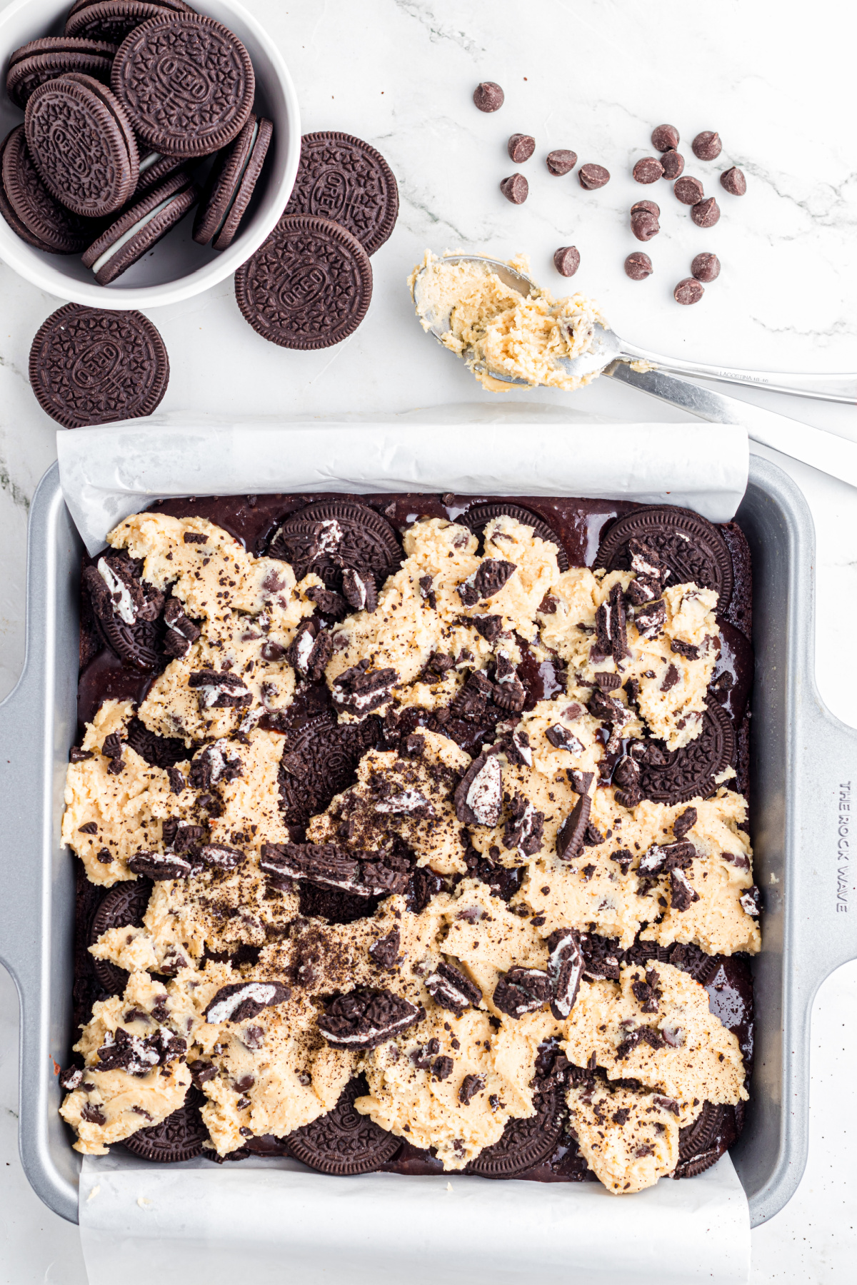 - Drop spoonfuls of cookie dough evenly over the Oreo layer. Gently flatten slightly, but allow some Oreo tops to remain visible.