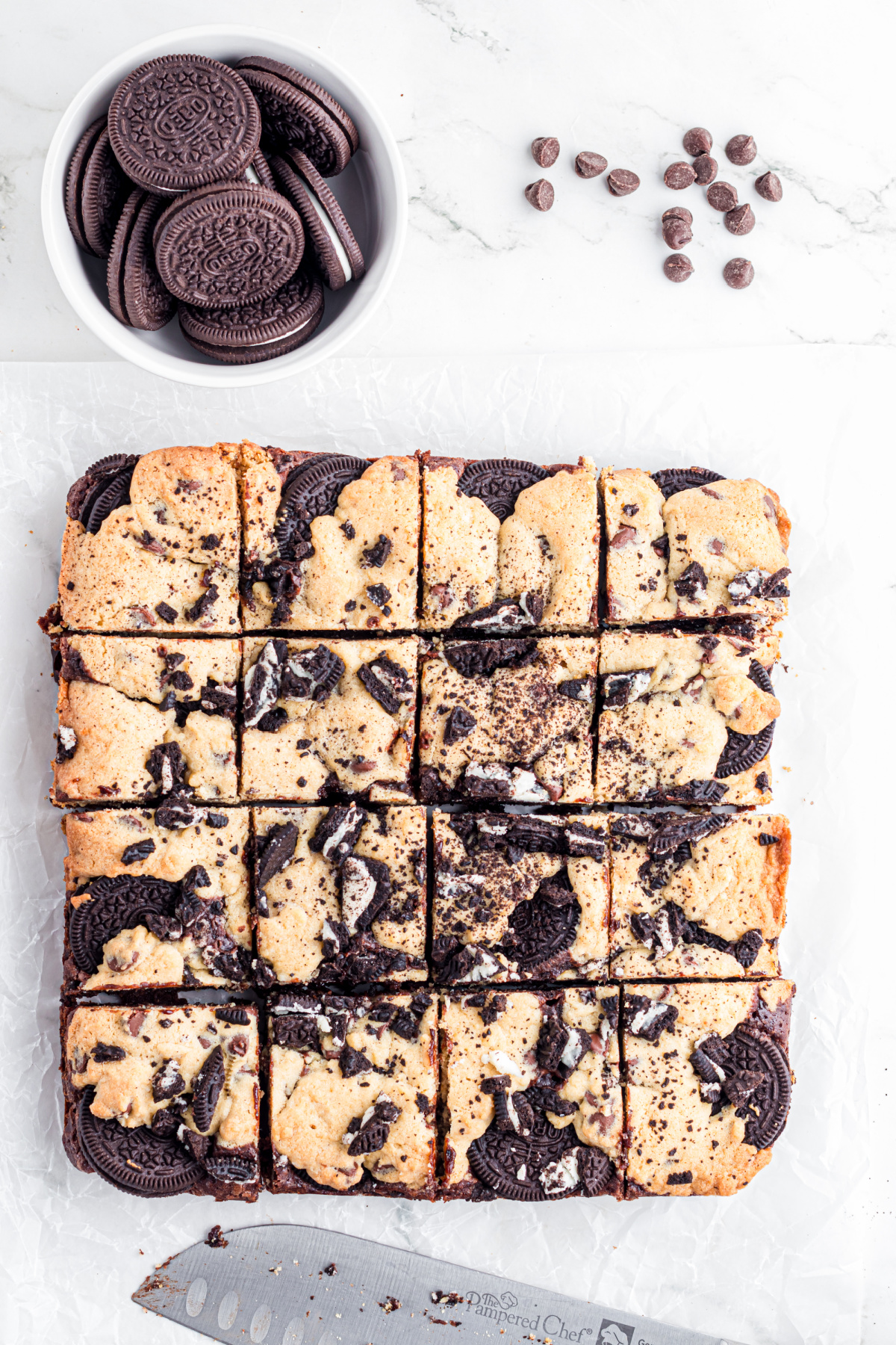 Par-baking the brownie layer helps prevent the Oreos from sinking and keeps the layers evenly defined.