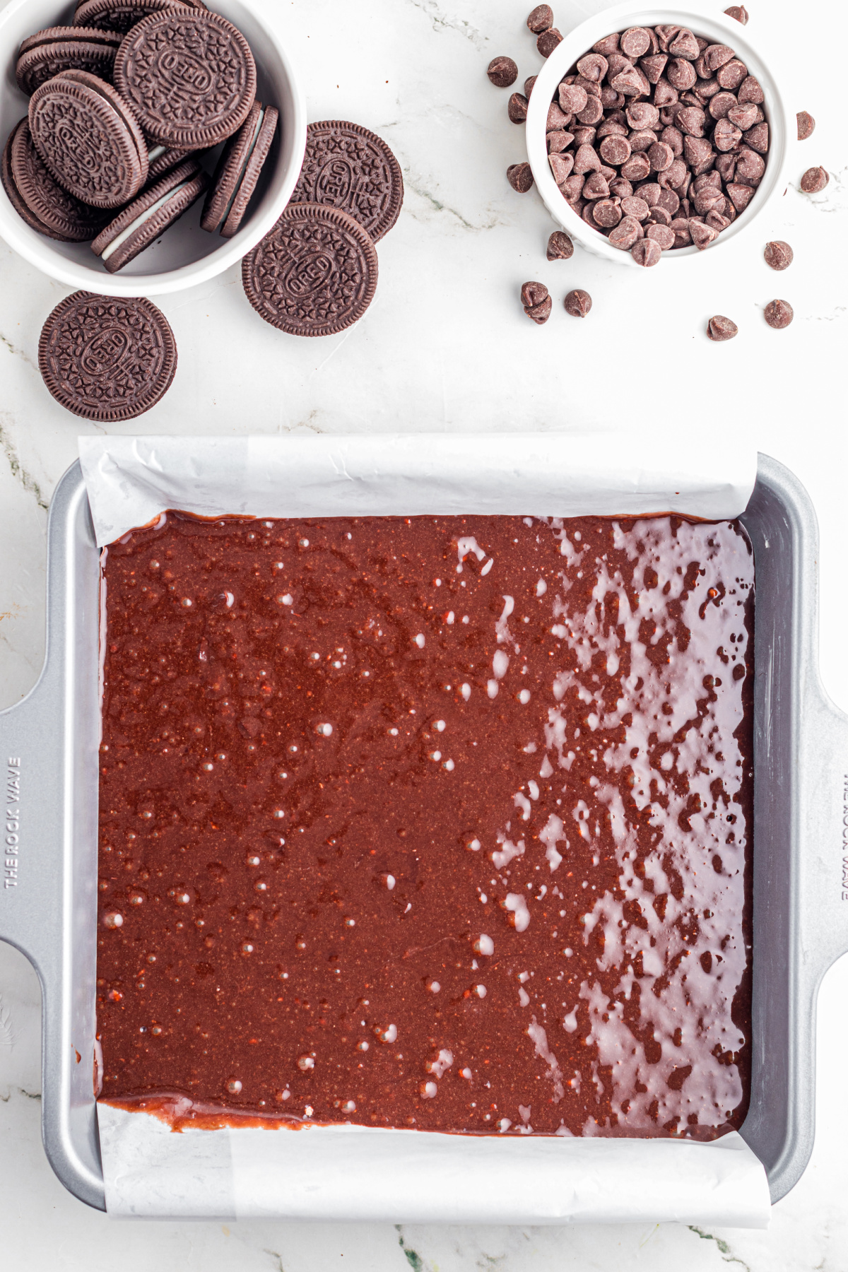 - Par-bake the brownie layer first: Baking the brownie base for 8 minutes helps the Oreo cookies stay in place instead of sinking into the batter.