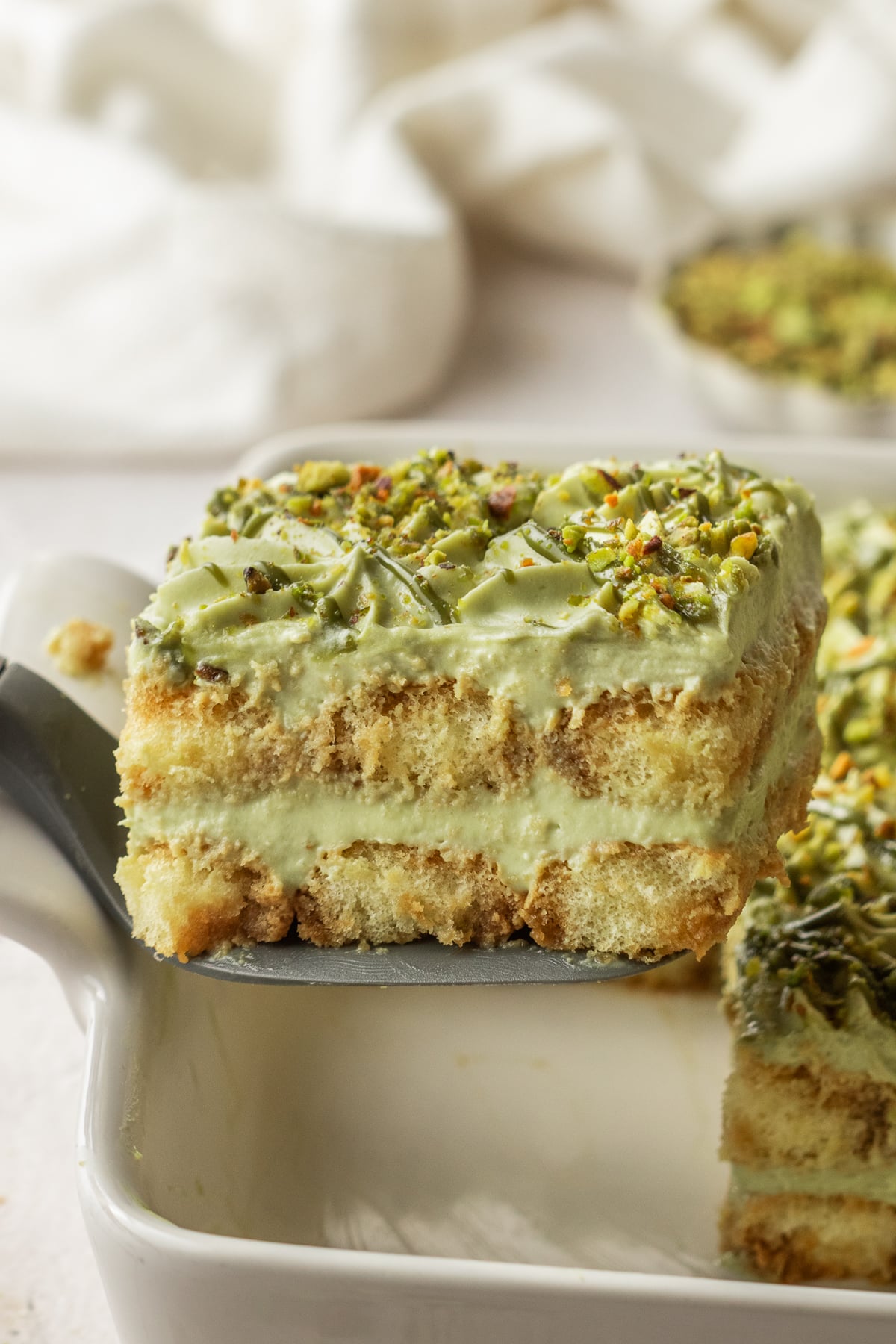 If you love classic tiramisu but want something visually stunning and packed with pistachio flavor, this version delivers. The filling whips up luxuriously thick and fluffy and the layers set beautifully in the fridge. The espresso keeps everything beautifully balanced and the drizzle of pistachio cream adds the perfect finishing touch to this layered pistachio dessert.