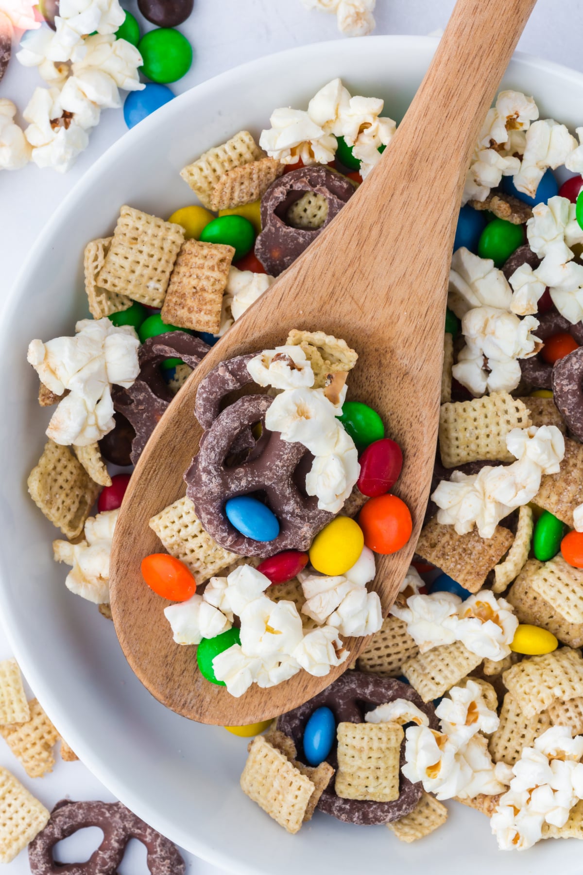 The best popcorn trail mix combines sweet, salty, and crunchy ingredients. Start with popcorn or cereal like Chex or Cheerios as your base, then add chocolate candies like M&M's, caramels, mini marshmallows or chocolate chips for sweetness.