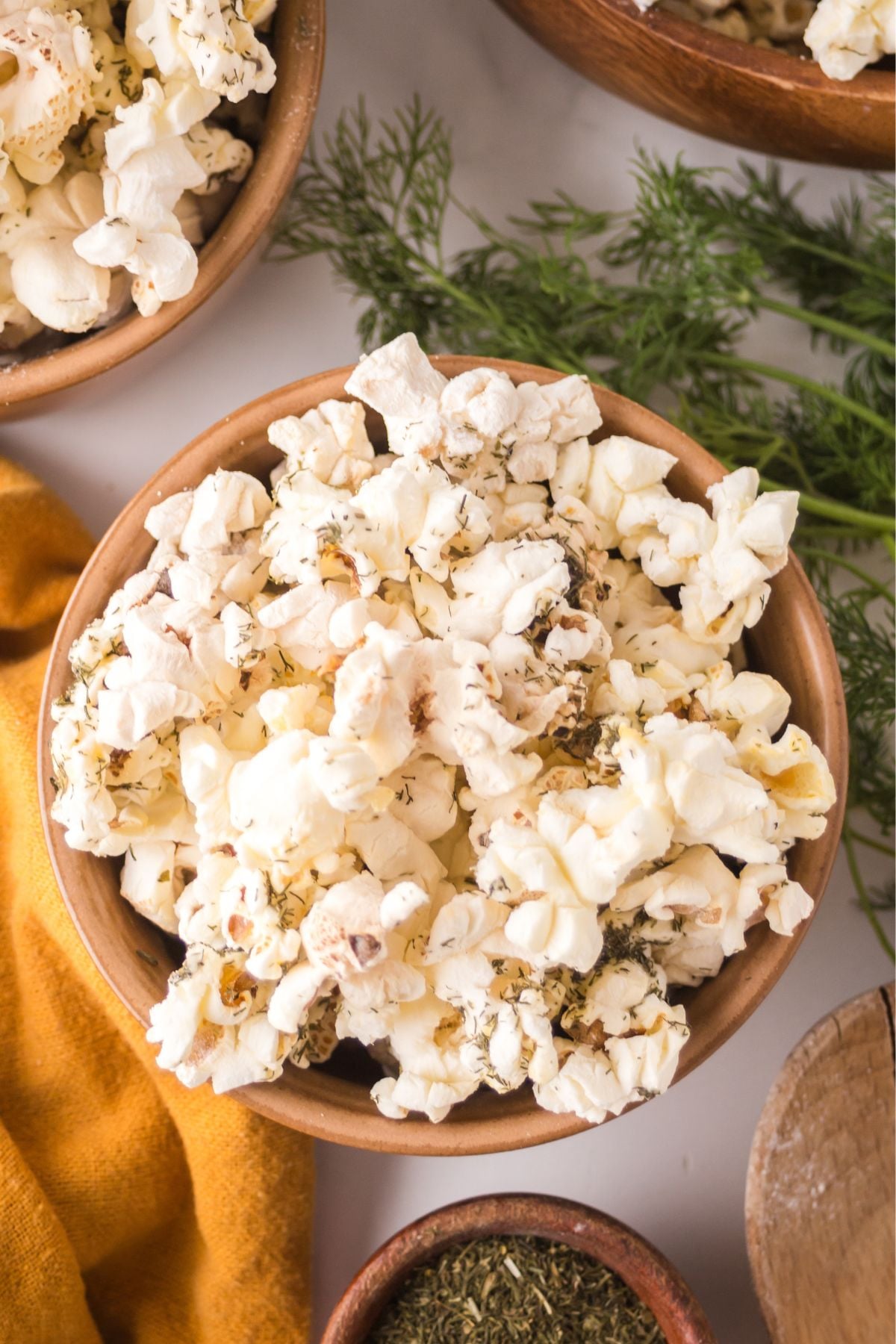 Prepare: Add the popcorn to a large mixing bowl. Drizzle the melted butter overtop and sprinkle the ranch seasoning and dried dill all over it.